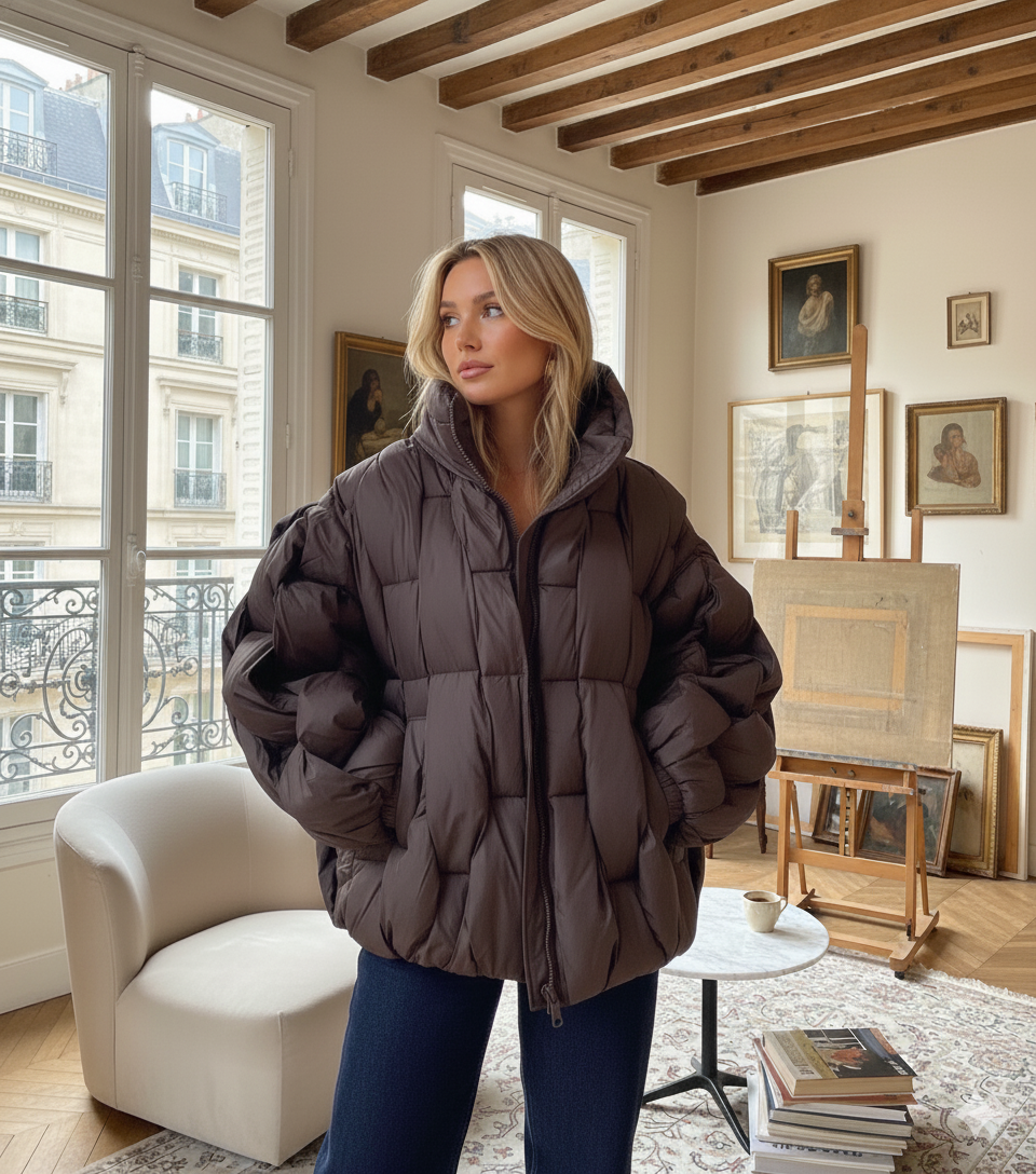 Coupe Oversize : La silhouette est volontairement ample, avec des épaules tombantes et des manches bouffantes qui renforcent son aspect moderne et confortable.